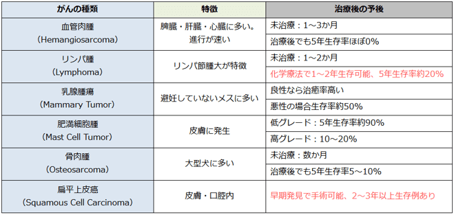動物病院で遭遇する頻度が高いがんの種類とその特徴、予後の目安を表にまとめました。(表1)