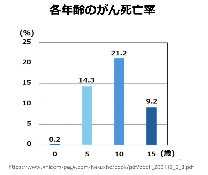 各年齢におけるがんの死亡率を見てみると、0歳~5歳では0.2%と割合としては少ないですが、5歳以上から急激に増加しています。