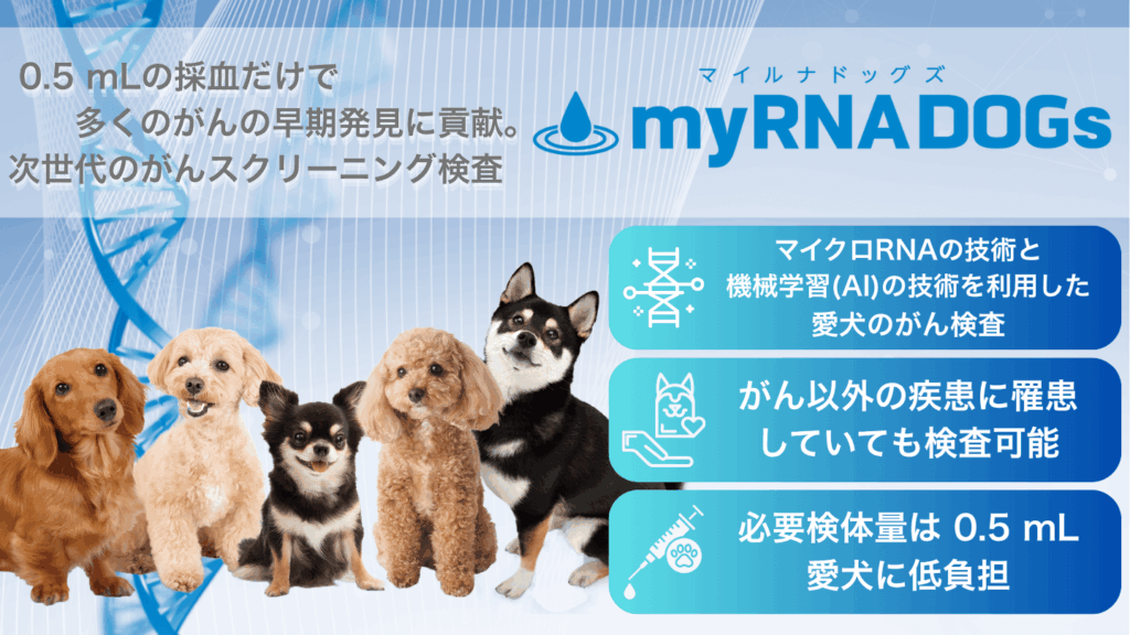 myRNA DOGs(マイルナドッグズ) 施設登録ページ_CAP ※本ページは獣医療従事者さま、関連医療機関さま向けです。 ーーーーーーーーーーーー▶ご施設の所在地によって、ご登録フォームが分かれております。該当するご登録フォームをご利用ください。 東京都、千葉県、神奈川県、埼玉県、愛知県、岐阜県、三重県の方はこちら ご登録フォーム 東京都、千葉県、神奈川県、埼玉県、愛知県、岐阜県、三重県 以外の都道府県の方はこちら ご登録フォーム ※飼い主さまからのお申込みはこちらのフォームからはお受付しておりません。かかりつけの動物病院さまにご相談ください。※本サービスのご利用には事前登録が必要となります。ご登録後、ユーザIDを発行いたします。また、飼い主さま向けリーフレットと獣医師さま向け手引き、検体準備の手引きを、入力いただいた住所に送付させていただきます。※本サービスは、アークレイマーケティング株式会社が委託する販売代理店を経由してご提供させていただきます。※価格情報については、ご登録後のご案内となります。ーーーーーーーーーーーー ☆News☆The Journal of Veterinary Internal Medicine (JVIM) に、イヌのがんのスクリーニング検査についての論文が掲載・公開されました!詳細はこちら 0.5 mLの血液から数十種類のがんの早期発見に ・次世代シーケンサ―を用いた最新技術で血中のマイクロRNAを網羅的に解析。得られたデータを機械学習で構築した解析モデルで分析し、がんの可能性をスコア化します。・0.5 mLの採血のみで検査が可能です。 ✓定期的な健康診断の受診目安(年1回、2回、3回など)を検討する材料として✓超音波検査や画像検査を実施する際の参考として※がんの種類の区別はできません。 myRNA DOGs(マイルナドッグズ) ご利用方法 ①初めてのご利用の場合は、本ページ内のご登録フォームから「施設登録」をお願いいたします。・ユーザIDを発行します。・飼い主さま向けリーフレットと獣医師さま向け検査の手引き、検体準備の手引き資料、ご発注についてのご案内を、入力いただいた住所に送付します。 ②販売代理店へご発注ください。・受託開始時に詳細をご案内します。・販売代理店からご連絡が入る場合もございます。 ③検査に必要な資材が届きます。④検体をご準備ください。・検体採取の注意点については「検体準備の手引き」や本ページ下部に掲載の動画にまとめております。ご確認ください。 ーーーーーーーーーーーー▶ご施設の所在地によって、ご登録フォームが分かれております。該当するご登録フォームをご利用ください。 東京都、千葉県、神奈川県、埼玉県、愛知県、岐阜県、三重県の方はこちら ご登録フォーム 東京都、千葉県、神奈川県、埼玉県、愛知県、岐阜県、三重県 以外の都道府県の方はこちら ご登録フォーム ※飼い主さまからのお申込みはこちらのフォームからはお受付しておりません。かかりつけの動物病院さまにご相談ください。※本サービスのご利用には事前登録が必要となります。ご登録後、ユーザIDを発行いたします。また、飼い主さま向けリーフレットと獣医師さま向け手引き、検体準備の手引きを、入力いただいた住所に送付させていただきます。※本サービスは、アークレイマーケティング株式会社が委託する販売代理店を経由してご提供させていただきます。※価格情報については、ご登録後のご案内となります。ーーーーーーーーーーーー アークレイが運営する『動物の医療と健康を考える情報サイト』もぜひご利用ください!イヌ・ネコの糖尿病をはじめとする生活習慣病に関する情報を発信中!さまざまなトピックスや最新情報、症例報告などをお届けします。 サイト会員になると、セミナー動画や色々なお役立ち資料をすべて無料で活用いただけます!